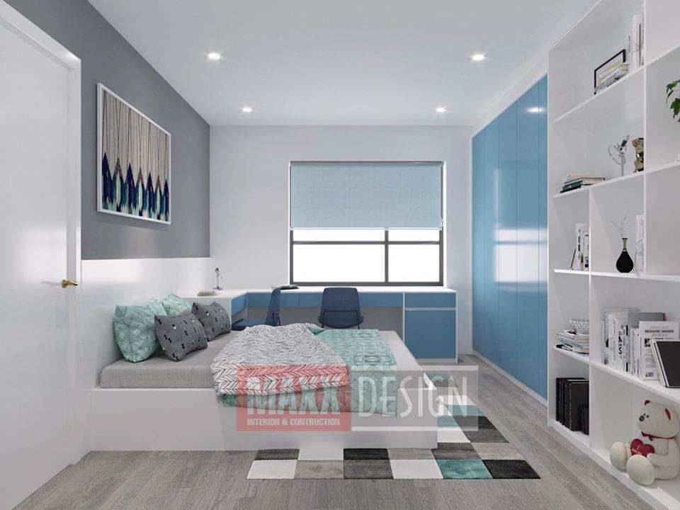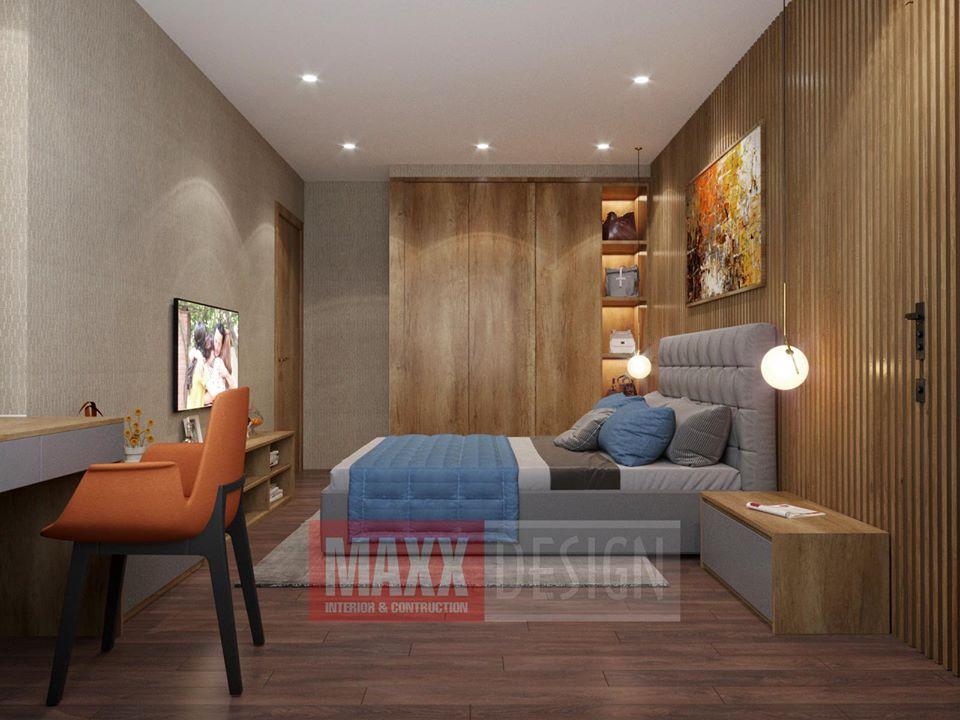 Đối diện giường ngủ là kệ ti vi, giúp mọi thành viên có thể theo dõi chương trình yêu thích. Mọi đồ nội thất trang trí đều được lựa chọn kỹ lưỡng nhằm đem đến một mẫu thiết kế nội thất chung cư tuyệt vời nhất.